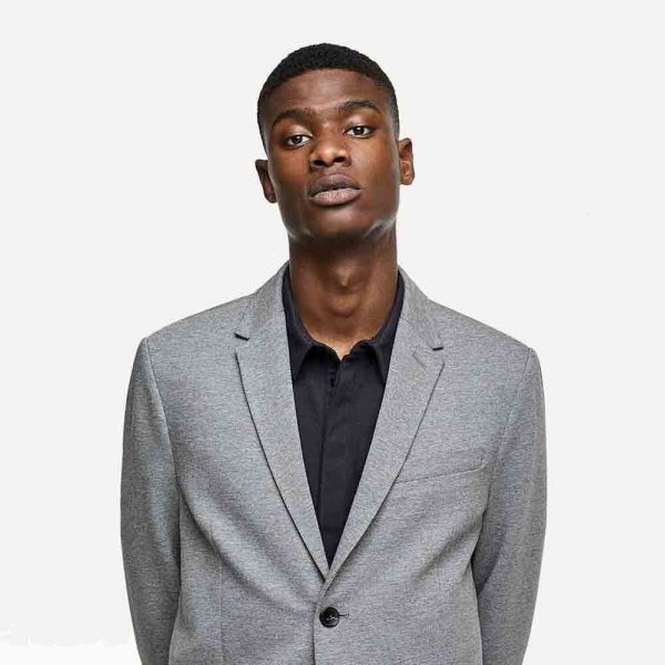 Long sleeve blazer with lapel collar. Front welt pockets at chest and hip. Middle back vent. Front button closure.